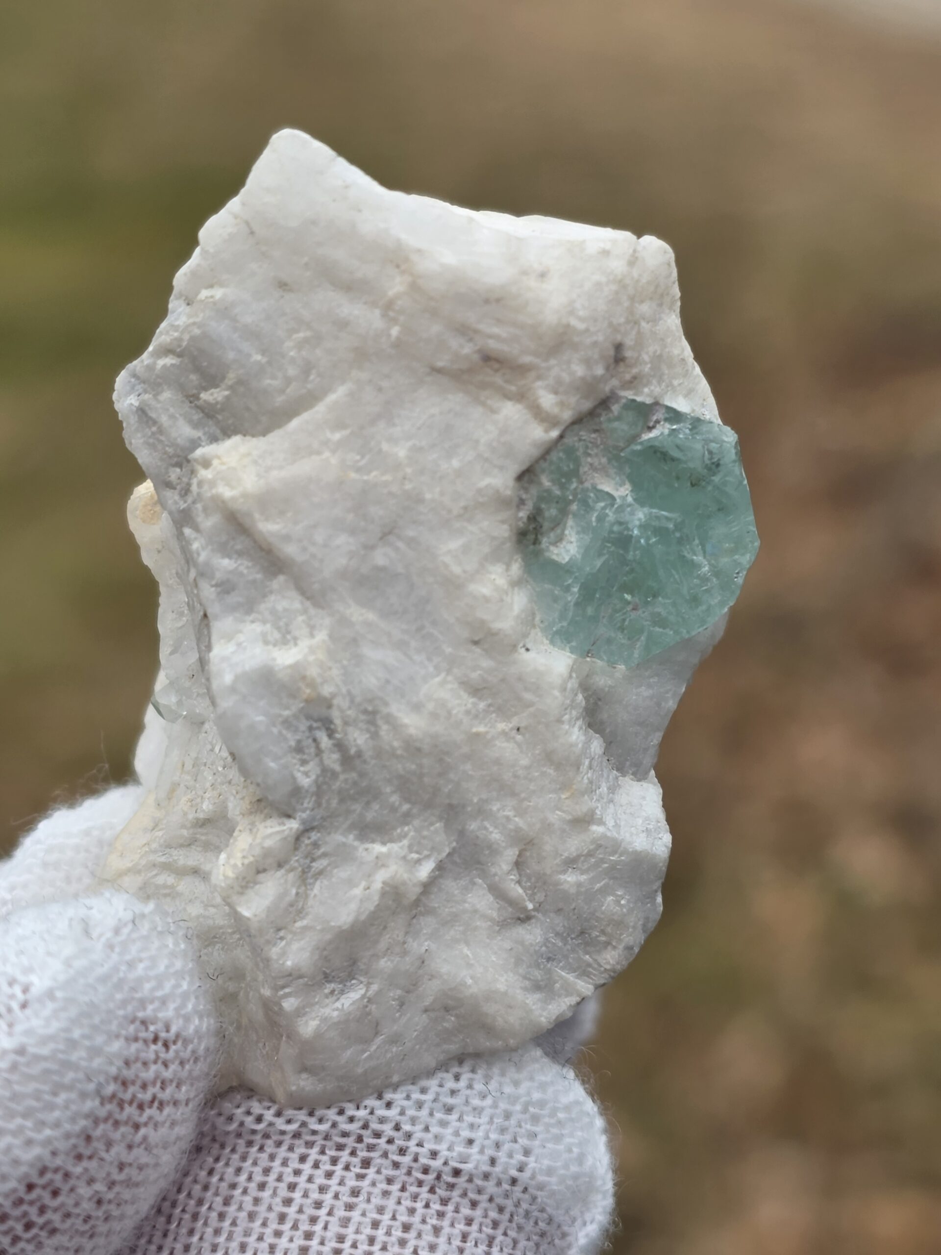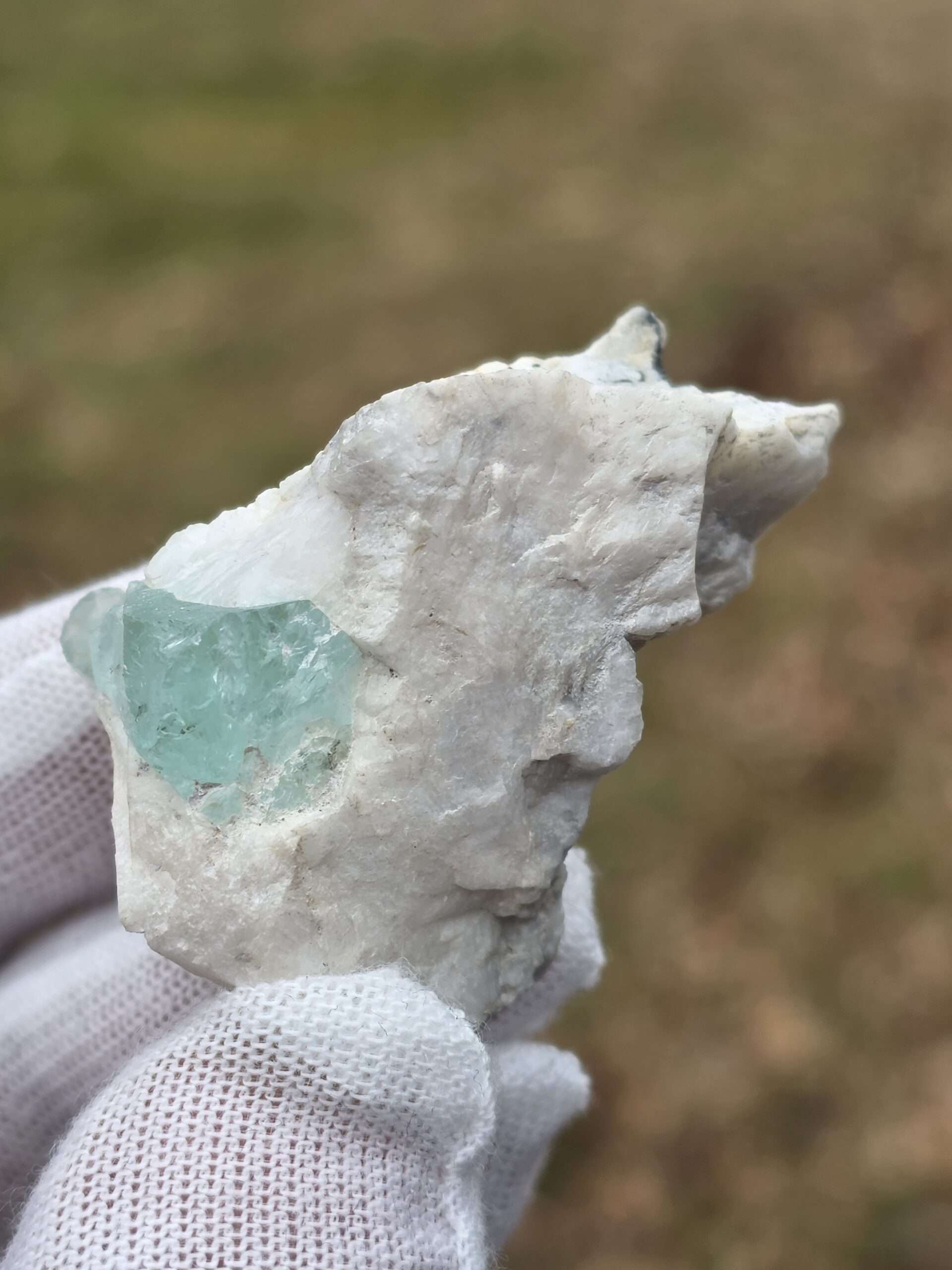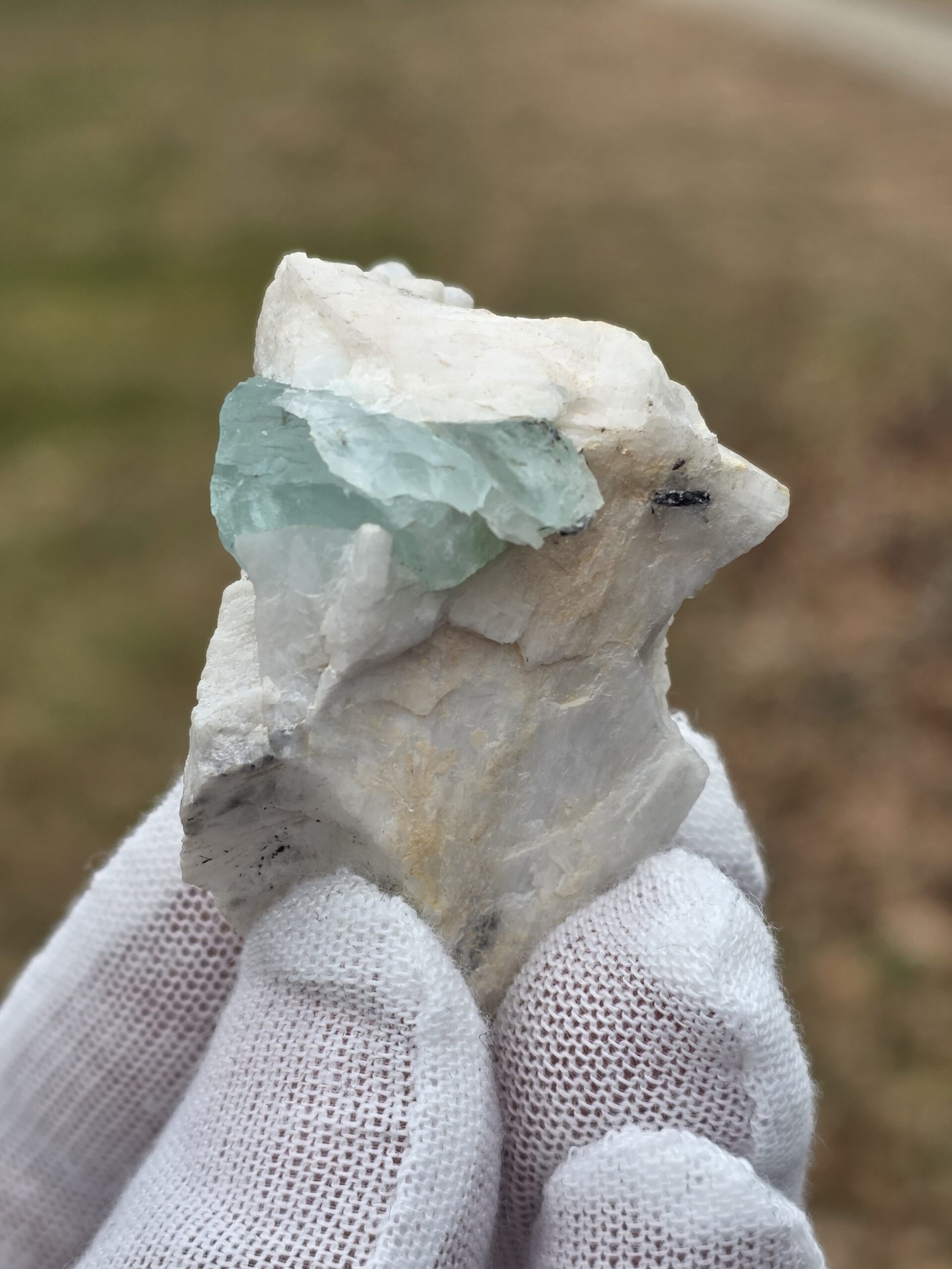 The bulk of the white/off-white host matrix is feldspar, very common in beryl-bearing pegmatites.
