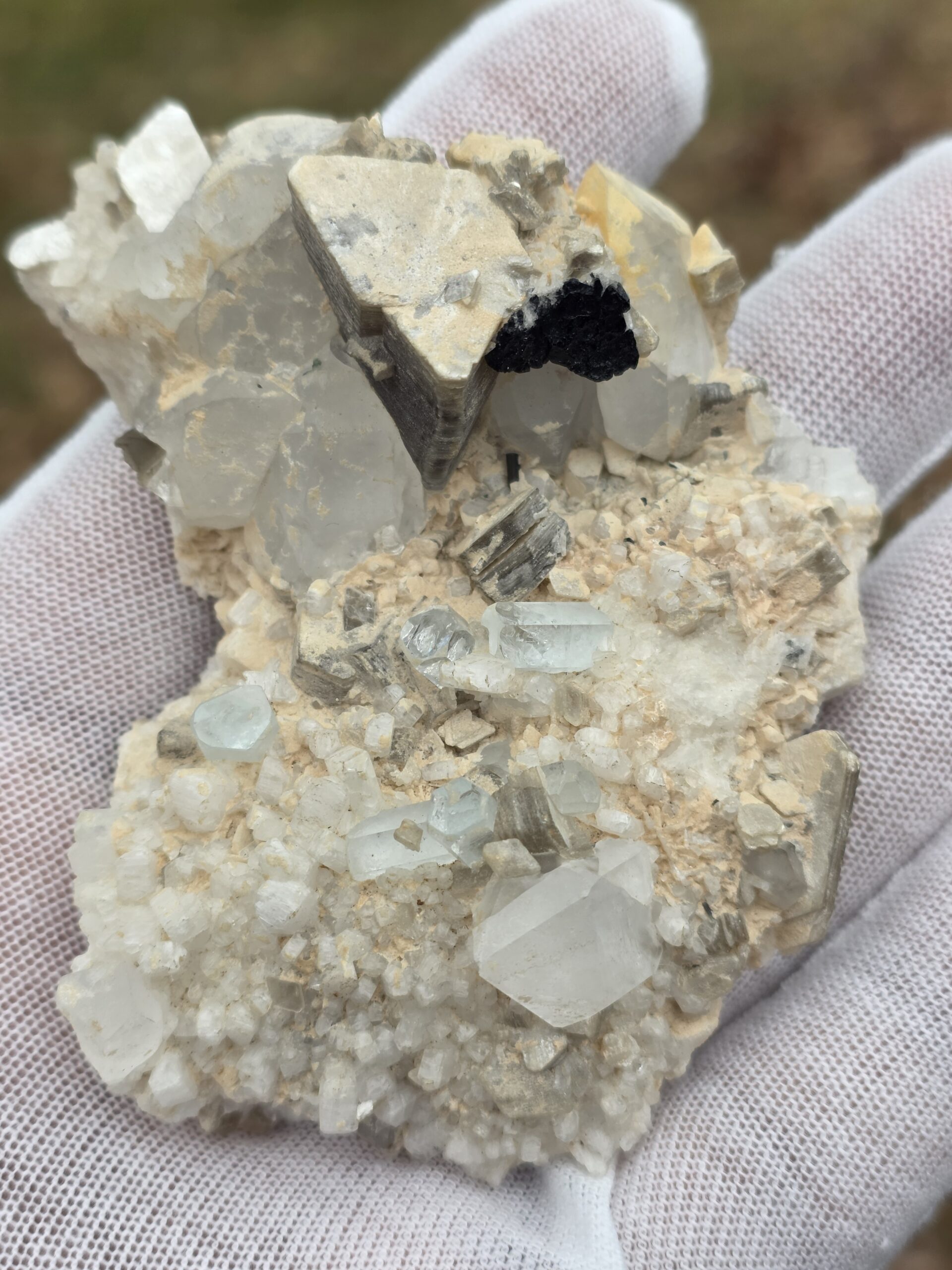 Several cream-beige crystal masses appear to be feldspar.